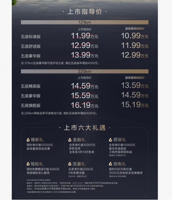 为回馈用户支持,捷途山海针对本次品鉴活动推出多重限时权益,政策有效期至 2025 年 9 月 30 日。新车官方指导价 11.99-16.19 万元,叠加置换补贴后,超级置换抢购价低至 10.99-15.19 万元,其中 121km 五座标准版置换价仅 10.99 万元,220km 五座旗舰版置换价 15.19 万元,大幅降低购车门槛。